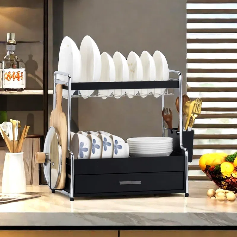 Un exemple de modèle à plusieurs niveaux hautement fonctionnel est l' égouttoir à vaisselle à 2 niveaux avec comptoir de cuisine en métal avec tiroir , qui combine des matériaux antirouille, un grand espace de séchage et des fonctionnalités de stockage supplémentaires.